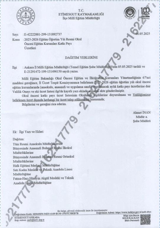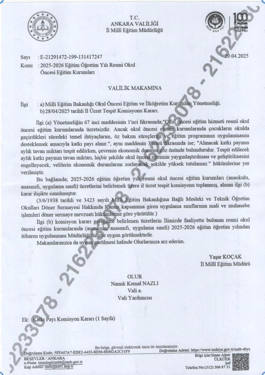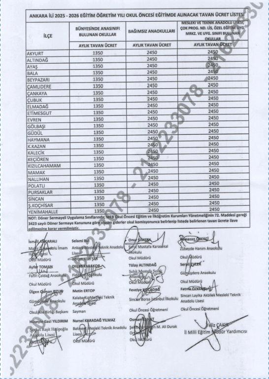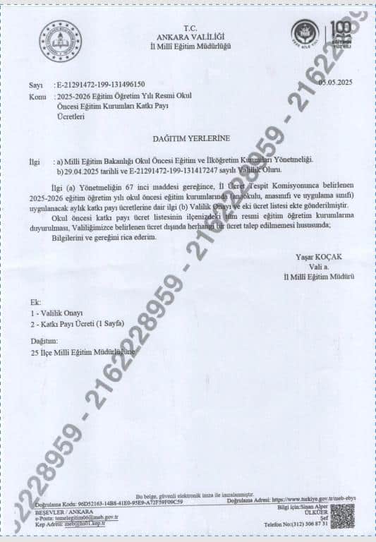 2025 - 2026 Eğitim Öğretim Yılı için Ankara ilinde okul öncesi eğitim kurumlarında alınacak katkı payı(aidat) tavan ücret listesi, Ankara İl Milli Eğitim Müdürlüğü tarafından açıklanmıştır.