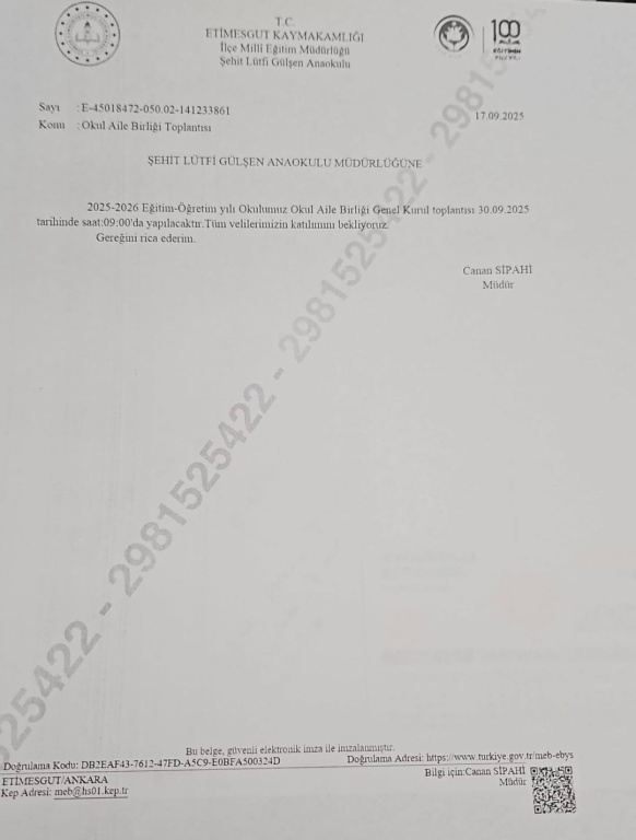 2025-2026 Eğitim Öğretim Yılı Okul Aile Birliği Genel Kurul Toplantısı 30/09/2025 tarihinde saat 09.00' da yapılacaktır.Tüm velilerimizin genel kurul toplantısına katılımını bekliyoruz.